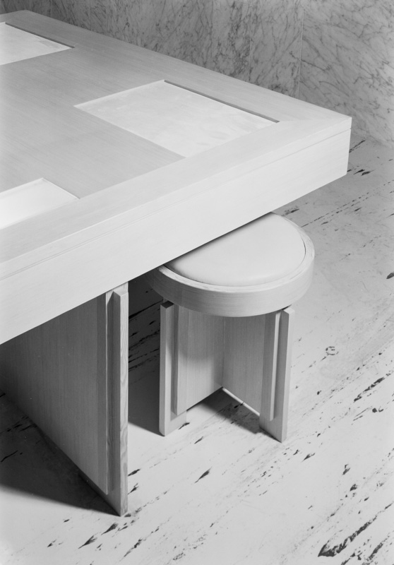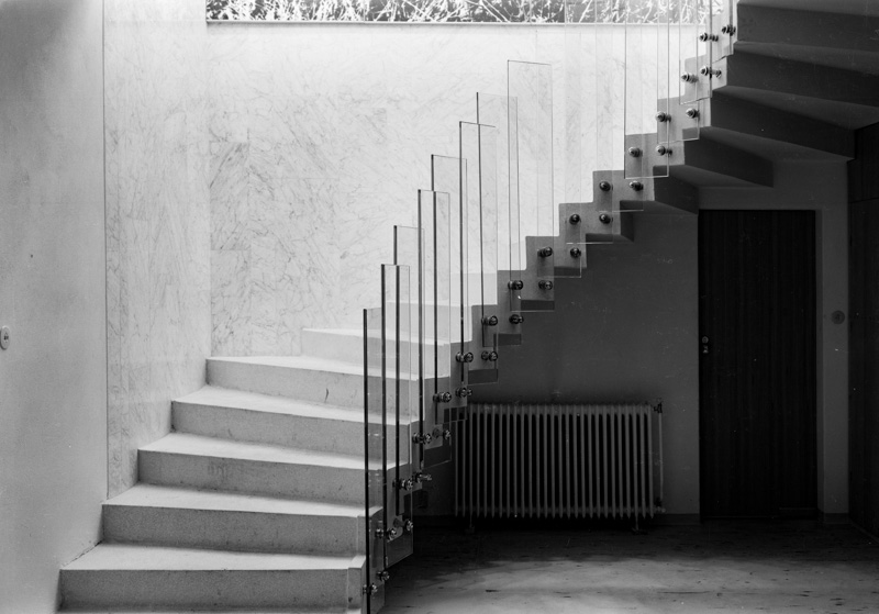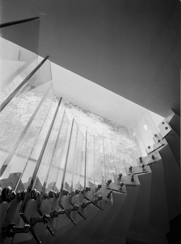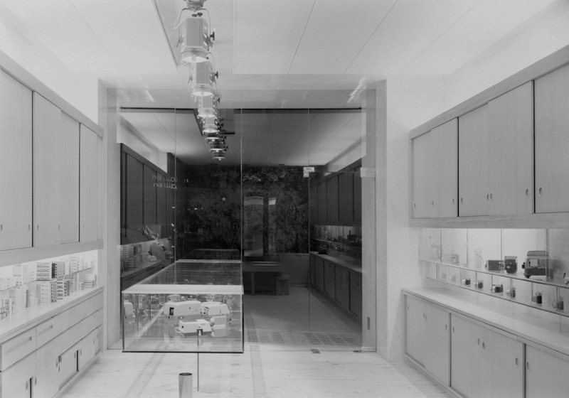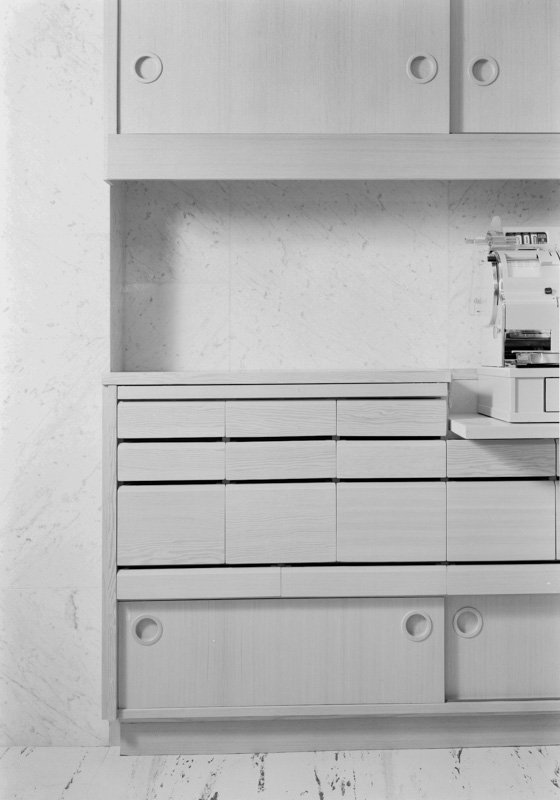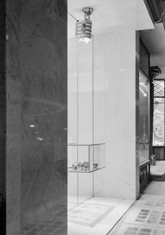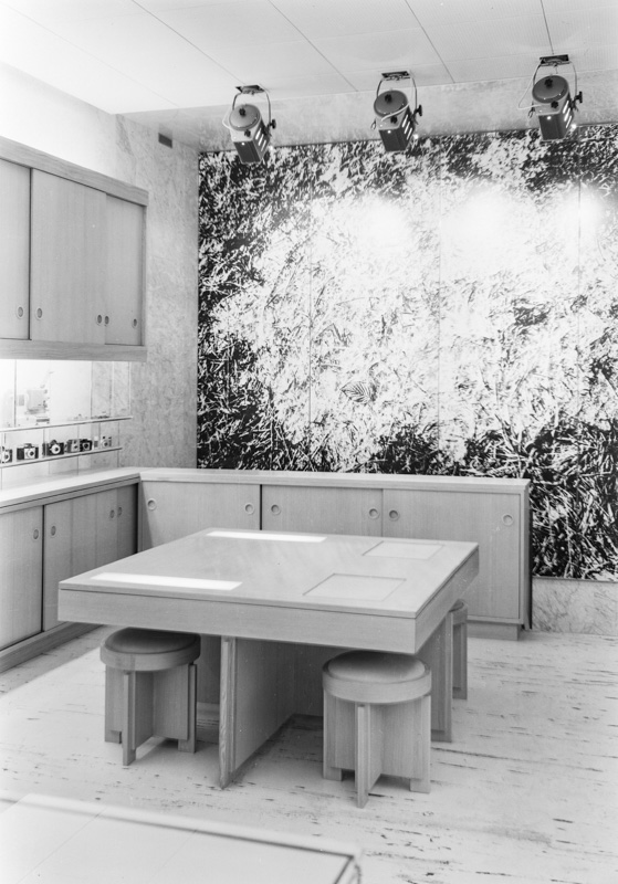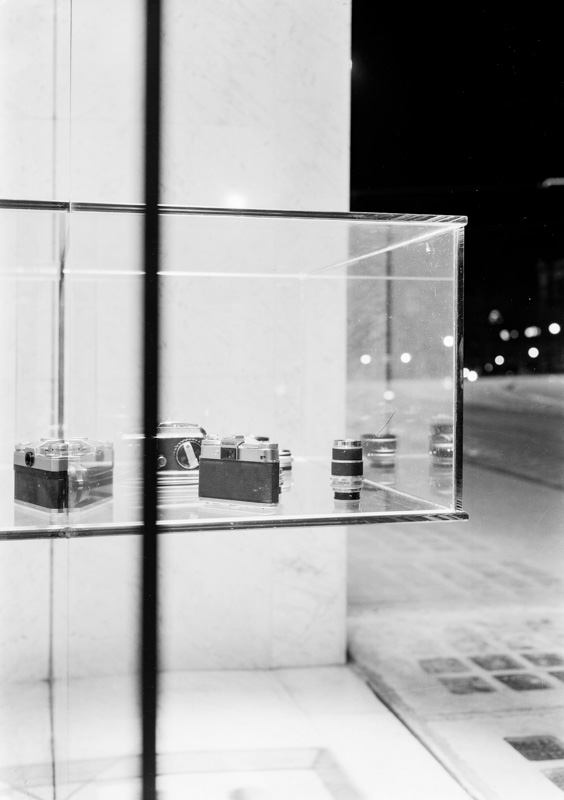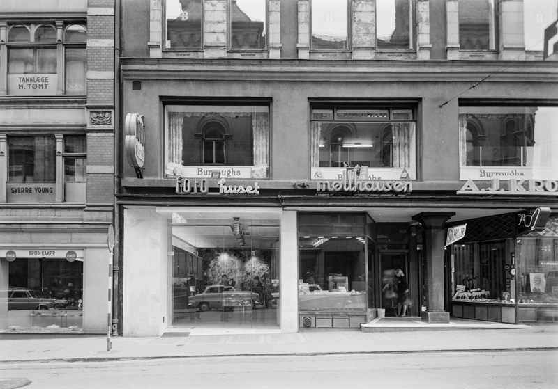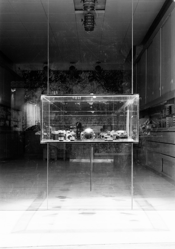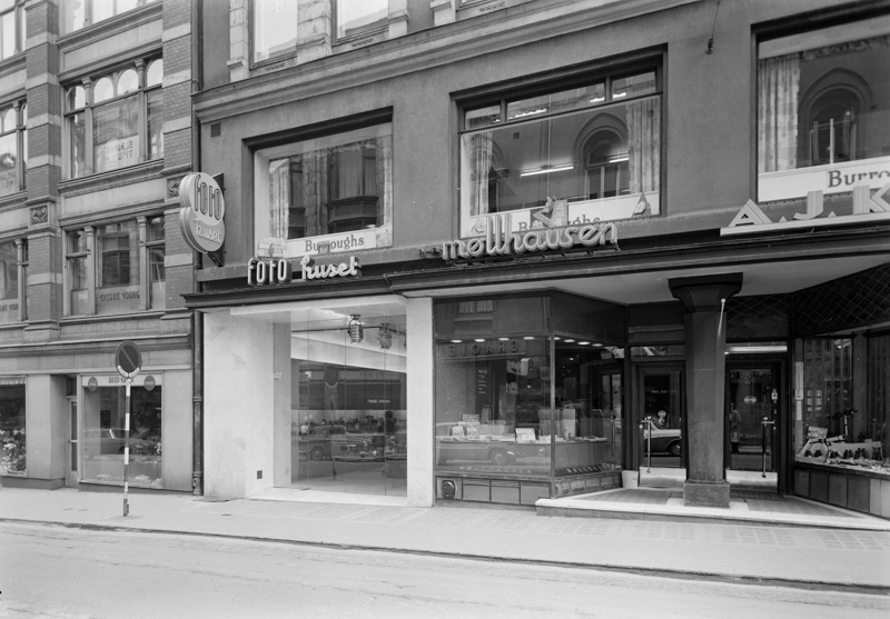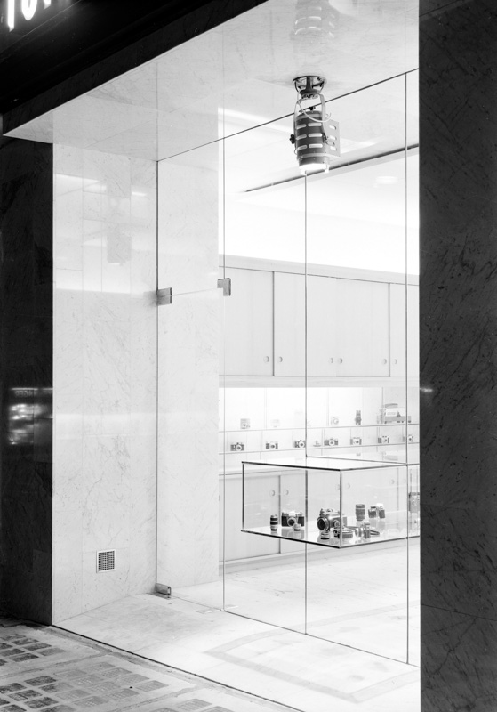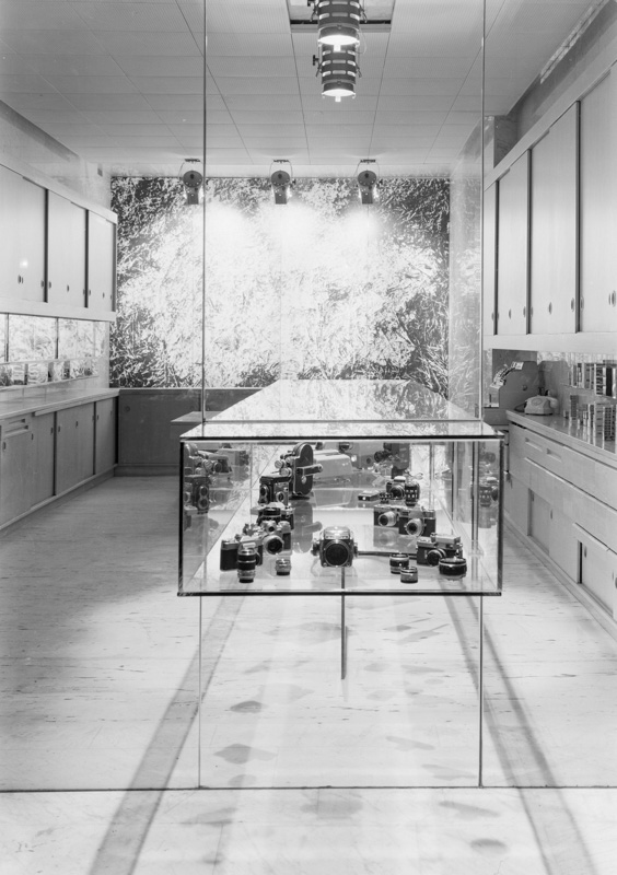 "Fotohuset" was a small shop for cameras in Oslo. It showcased the cameras almost as jewelry. The whole shop can be seen as an allegory for a camera, with glass in the front and paper in the back. The photo at the back wall is "Grass in frost" by Carl Nesjar.